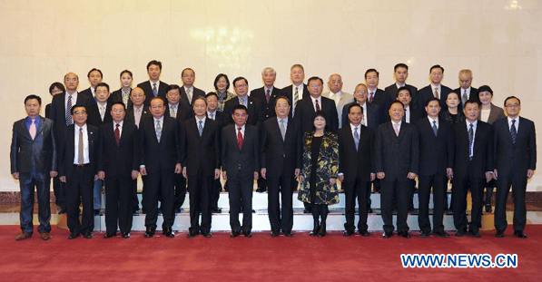 Yu Zhengsheng (front, C), a member of the Standing Committee of the Political Bureau of the Communist Party of China Central Committee and chairman of the National Committee of the Chinese People's Political Consultative Conference, poses for a group photo with representatives of trade union circles of southeast China's Taiwan while meeting with them in Beijing, capital of China, April 17, 2013. The representatives are here to attend the 2013 cross-Strait trade union forum. (Xinhua/Zhang Duo)