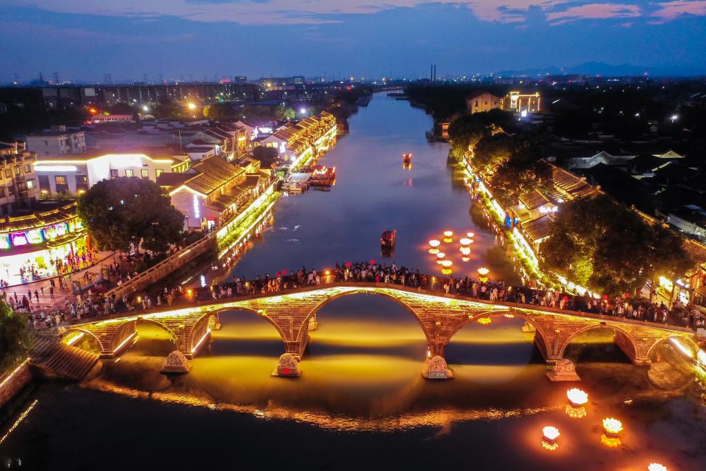 10月2日,遊客在塘棲古鎮的廣濟橋觀賞運河夜景(無人機照片)。新華社記者 徐昱 攝