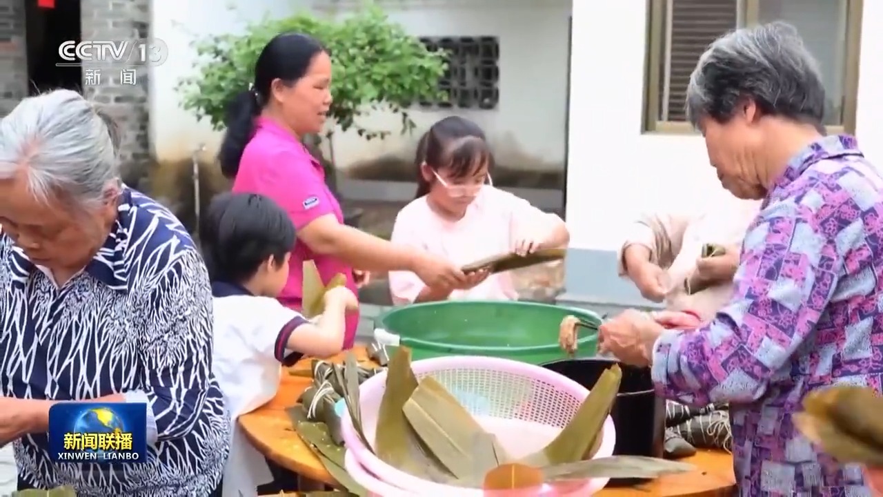端午時節,粽葉飄香。在廣西玉林容縣,大家圍坐在庭院中,包起長條粽、牛角粽等特色粽子;在上海、四川成都,中外遊客走進公園,現場制作、品嘗端午香粽。
