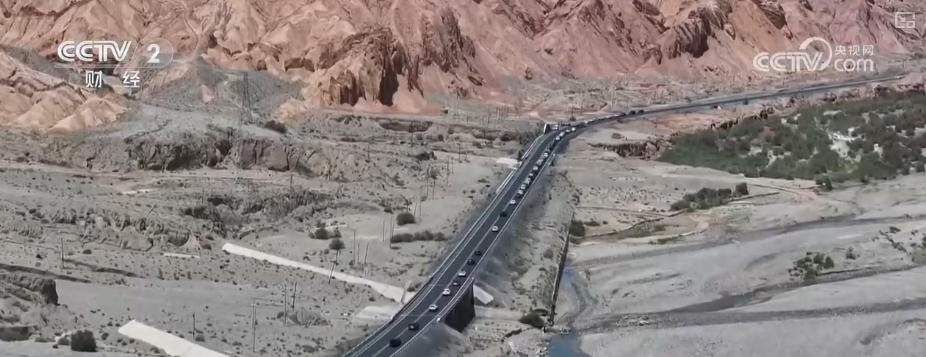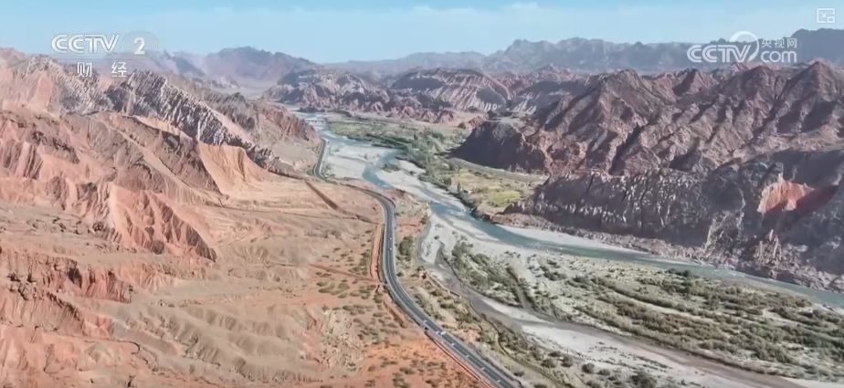 獨庫公路南段主要在新疆庫車境內,這里景色與北段相比獨有特色。在紅山石林景觀臺上遠遠望去,赤紅的岩壁在陽光下泛著耀眼的光芒,與附近不同色彩的山體交相輝映。